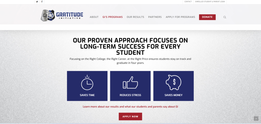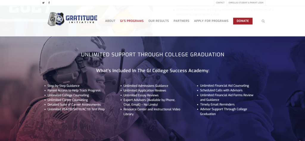 At Gratitude Initiative, we serve our nation and communities by working side by side with our military and law enforcement families to help their children successfully prepare for college, pay for college, and graduate with the right degree for them.